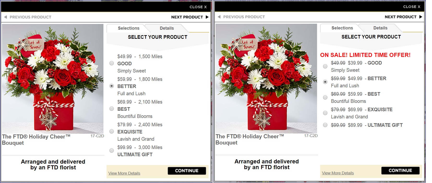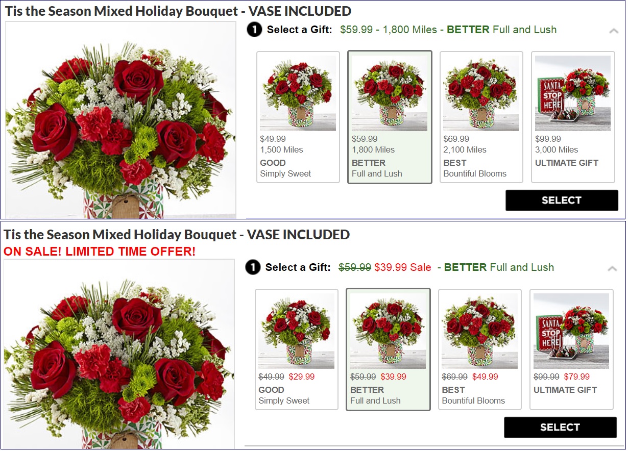 I clicked through the link in the email I received and also went directly to the FTD site. The prices on many of the bouquets are different depending on which version you choose. It turns out that FTD doesn’t pass along the “sale” price on the cobrand portal. In this example it is $10-20 in price variation; I’ve seen different numbers in the past.