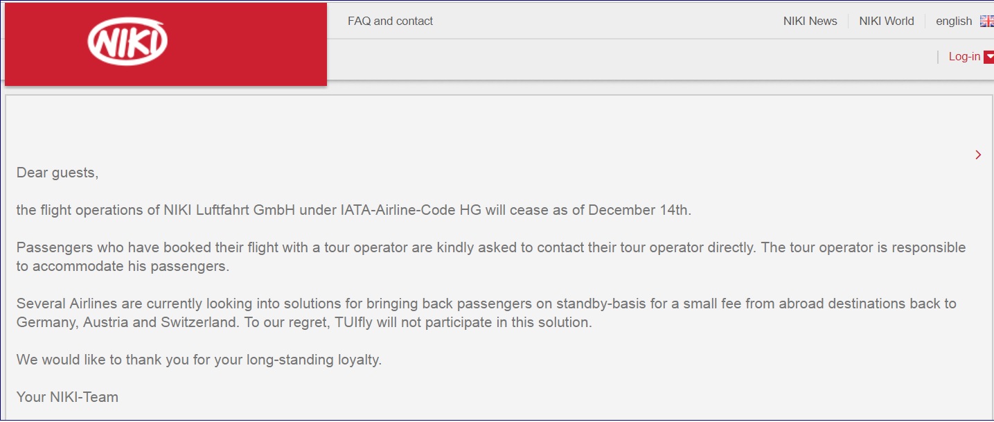 Austrian LCC and former Air Berlin subsidiary Niki airlines is no more. The carrier announced today that it would halt operations, filing for insolvency as the planned acquisition by Lufthansa fell through. With no funding immediately available flights are being canceled, leaving many potential holiday travelers out in the cold. The carrier indicated it was in discussion with other European airlines to assist with repatriation flights but nothing is confirmed yet.