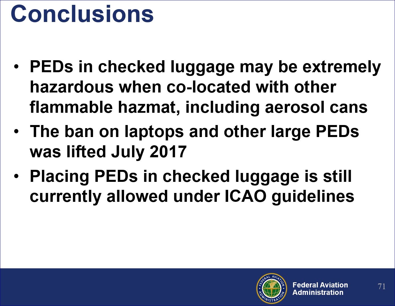 The electronics ban cause flights from 10 airports inbound to the United States to not allow passengers to carry devices larger than a cell phone in the cabin. The affected airlines responded by collecting the “dangerous” devices from passengers, boxing them up and putting them in the baggage hold. Carrying the Li-ion batteries as cargo is in direct contravention of multiple recommendations and policies on a global scale. It was a terrible plan when it was implemented, stoking concerns from IATA, trade groups and anyone with insight into the cargo safety space. Fortunately it was a relatively short-lived ban – just a few months – but the increased risk during that time was very real. That same risk caused airlines to ban hoverboards in 2015 and most “smart” luggage batteries in 2018. The Trump Administration ignored those risks in favor of the ban policy.